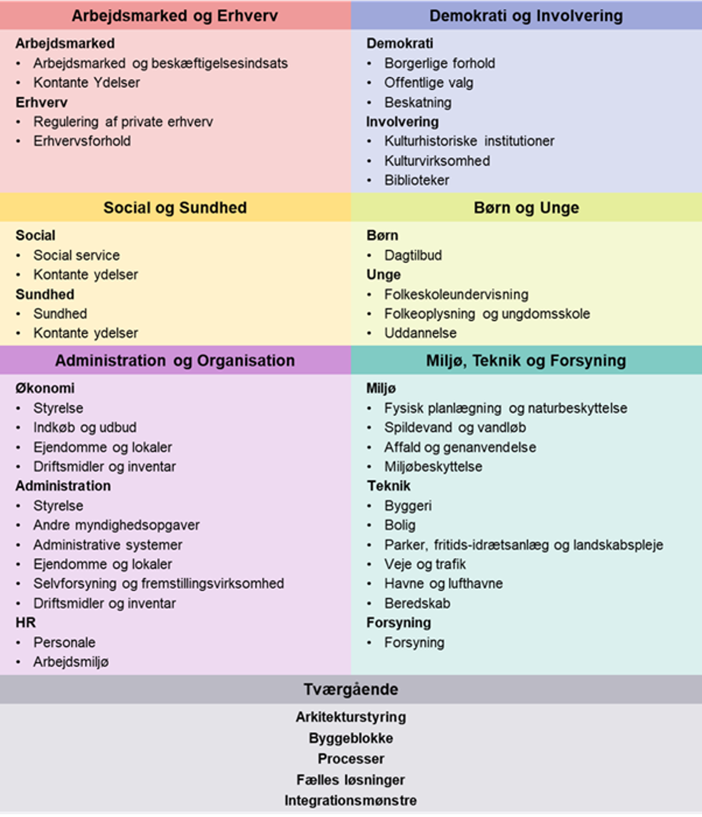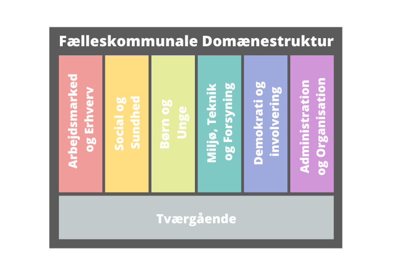 Domænestrukturen består af to niveauer. Første niveau af domænestrukturen inddeler den kommunale forretning i seks hovedforretningsområder samt en tværgående kategori som går på tværs af de seks hovedforretningsområder. På andet niveau er de seks hovedområder inddelt i to undergrupperinger, som inddeler hovedforretningsområderne i forretningsområder. På tredje niveau i domænestrukturen inddeles efter kommunale opgaver som er defineret i hovedopgaverne i KL’s Emnesystematik.