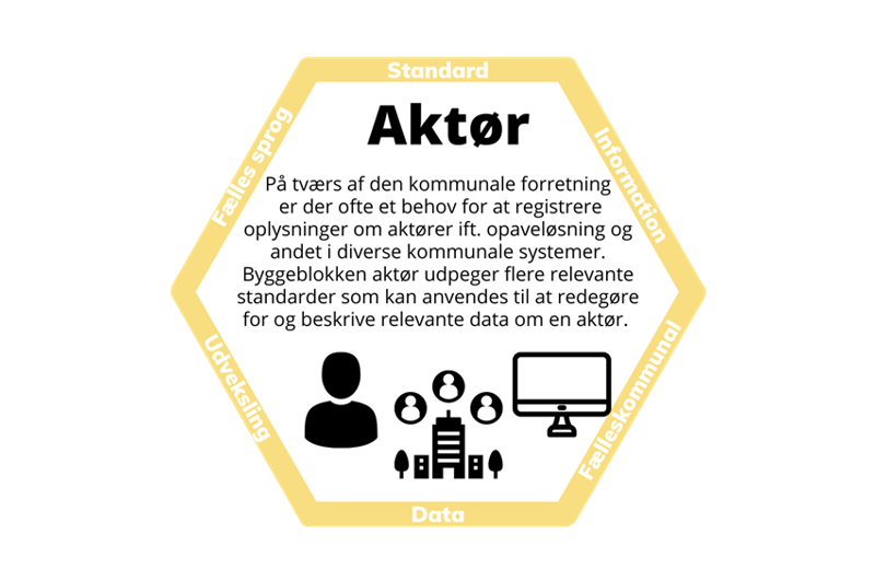 Byggeblokken Aktør redegør for de relevante standarder som kan bruges til at beskrive aktører i en kontekst. Dette kan understøtte standardisering af data og begrebsafklaring indenfor et fagområde, eller på tværs af flere fagområder. Så man opnår en fælles forståelse af data, som forudsætning for eksempelvis udveksling af data mellem forskellige fagområder med hver deres begrebsverden.