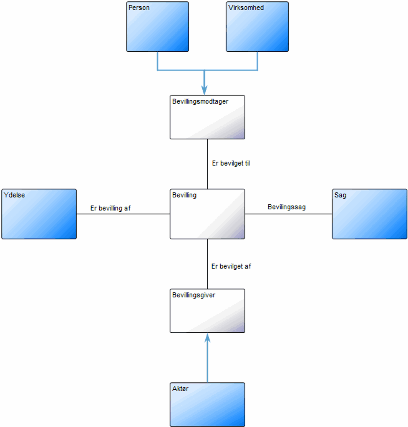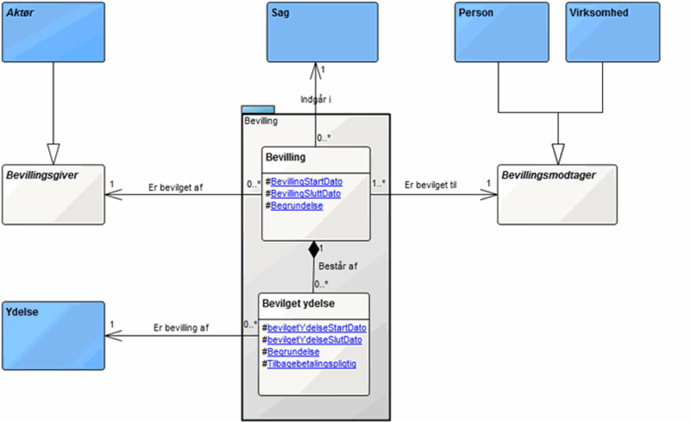 Læsevejledning til modeller for Bevilling: Formålet med objektmodellen for byggeblokken Bevilling er at vise hvilke andre byggeblokke Bevilling har en relation til. Formålet med informationsmodellen for byggeblokken Bevilling er at vise hvilke oplysninger som er relevante i forhold til at beskrive en Bevilling. Objekter med farven grå er en del af byggeblokken Bevilling, og objekter med farven blå repræsenterer andre byggeblokke som hver især har deres egen objekt- og informationsmodel.