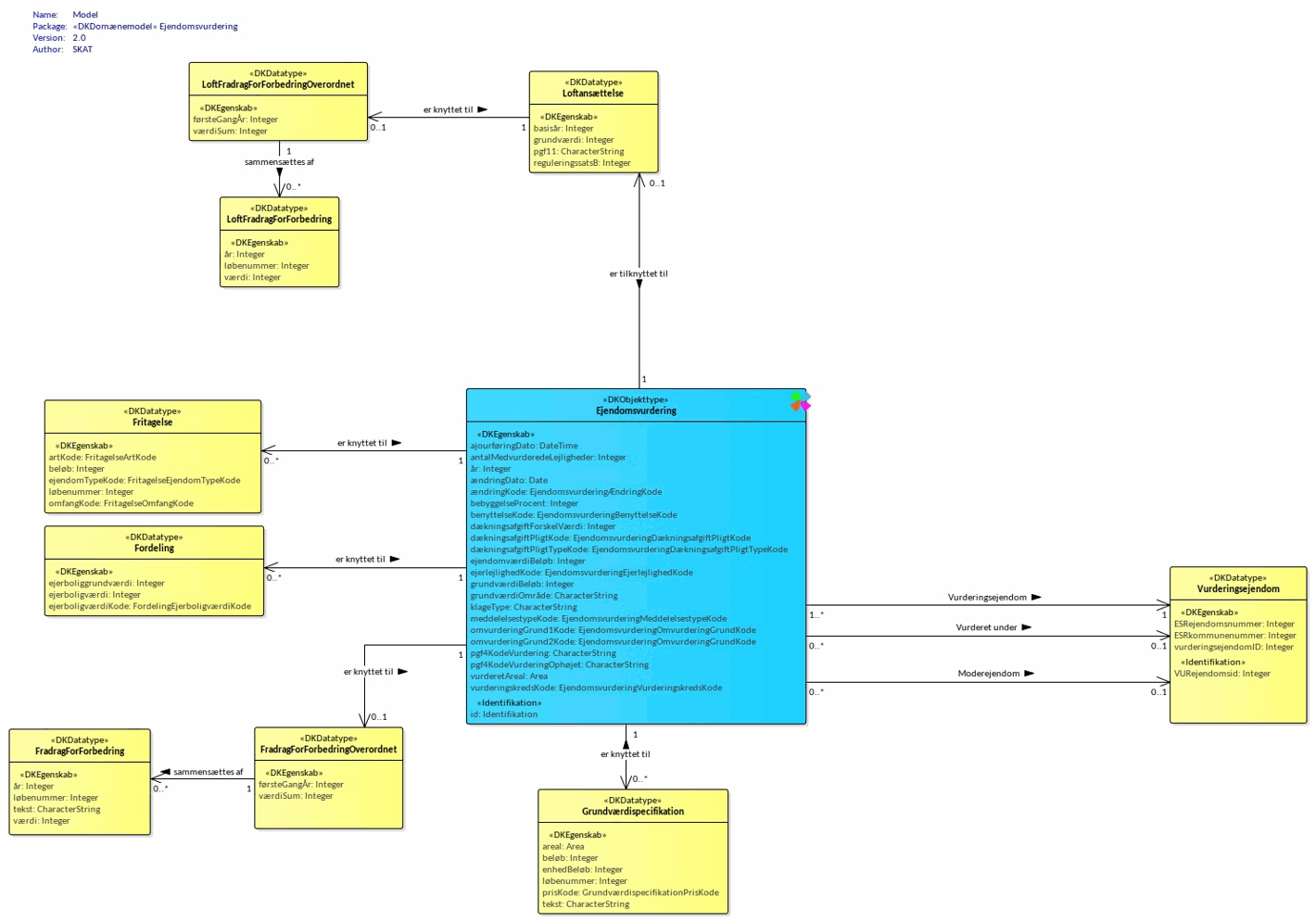 Der er ikke lavet et informationsmodel for Ejendomsvurdering i regi af Rammearkitekturen, Grunddatamodellen for Ejendomsvurdering kan tilgås her: