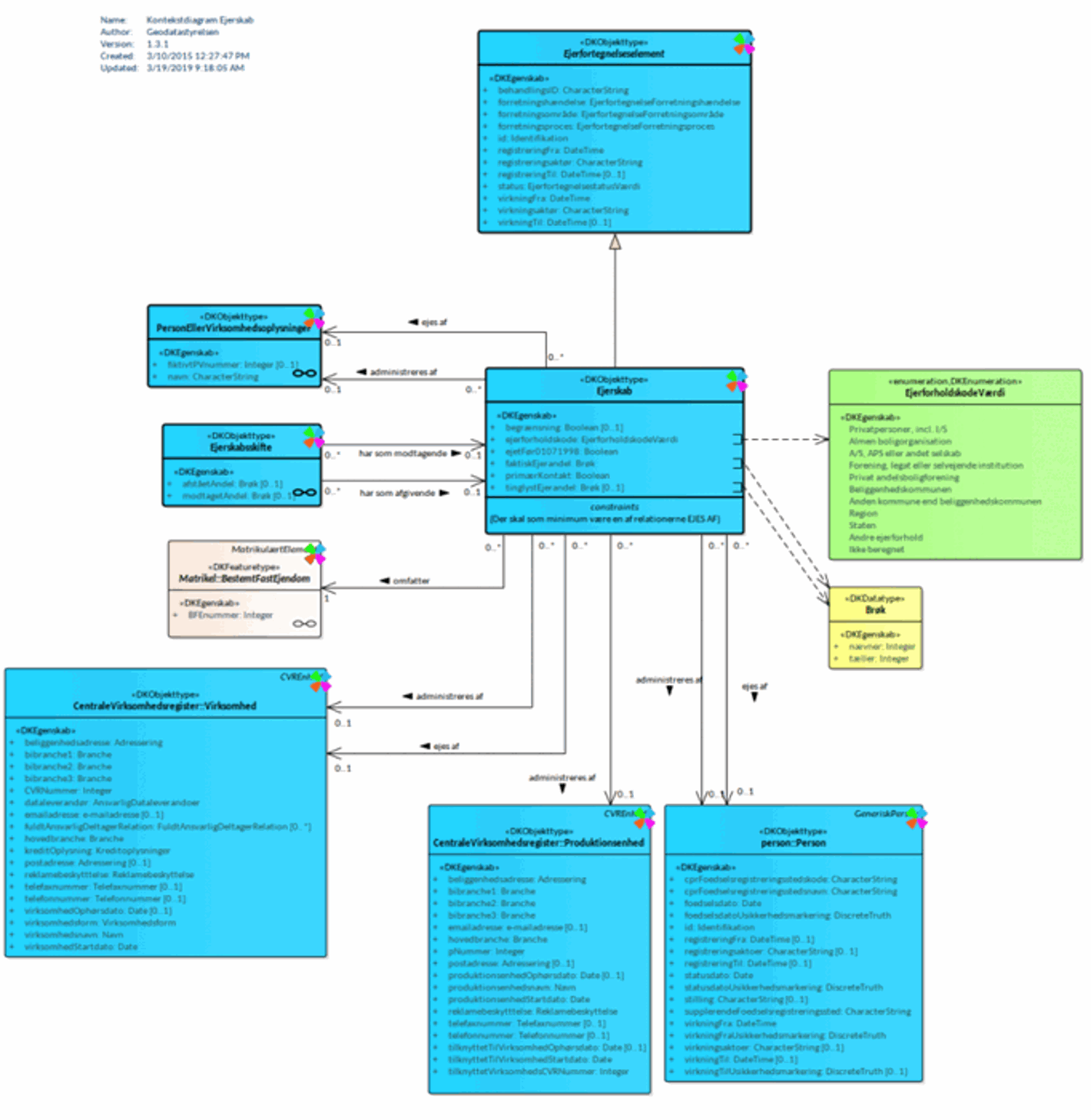 Der er ikke lavet et informationsmodel for Ejerskab i regi af Rammearkitekturen, da der allerede er en informationsmodel i grunddatamodellen for Ejerskab, som kan tilgås på nedenstående link