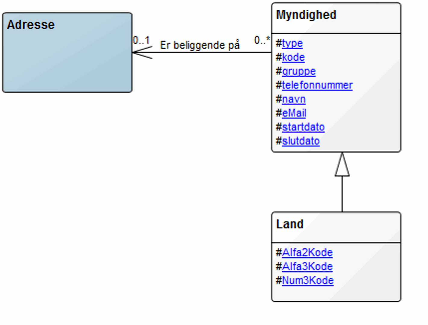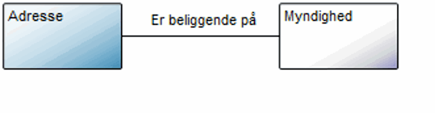 Ingen umiddelbar sammenhæng til andre byggeblokke. Referencen til Adresse er i øjeblikket på logisk plan, da adressen er indbygget som tekstlinier i Myndighed.