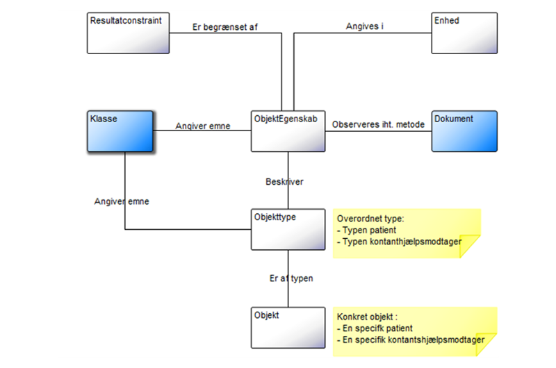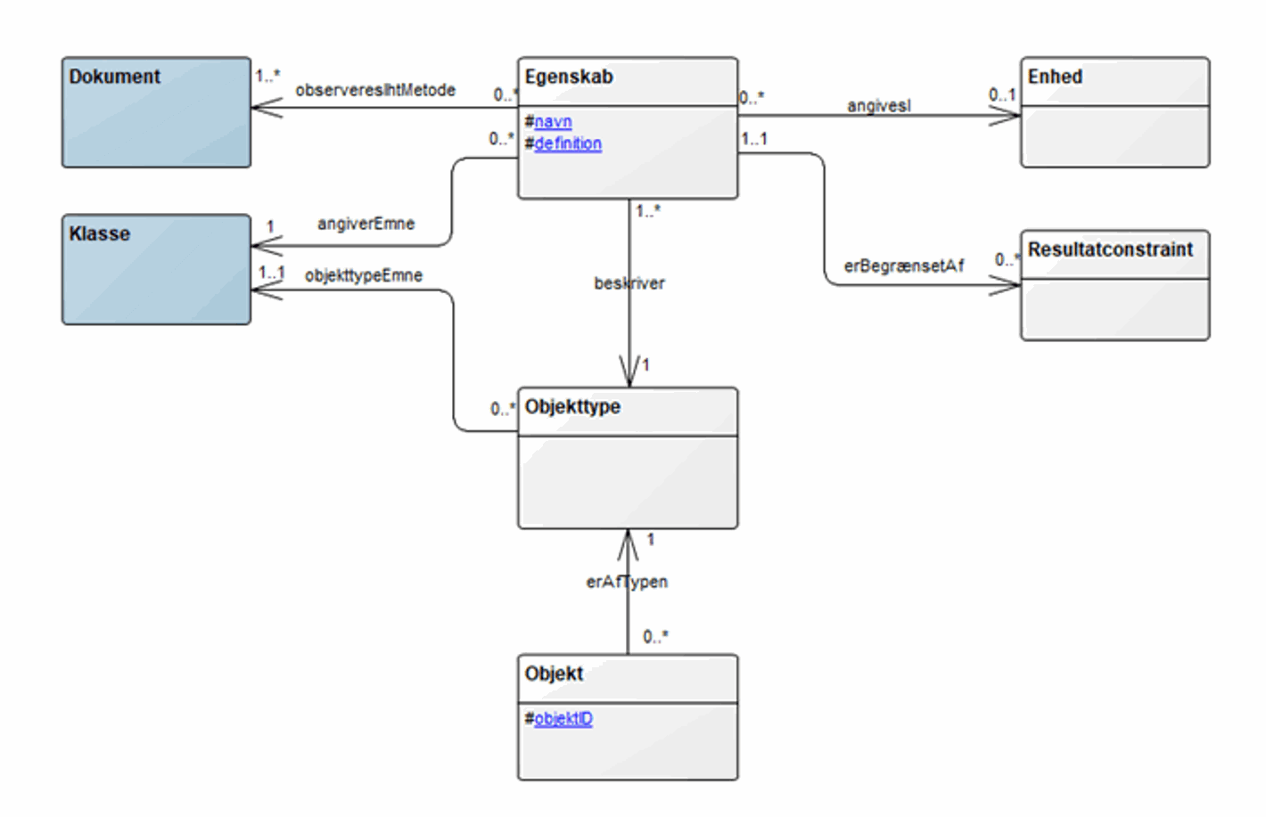 Formålet med objektmodellen for byggeblokken Objekt er at vise hvilke andre byggeblokke Objekt har en relation til. Formålet med informationsmodellen for byggeblokken Objekt er at vise hvilke oplysninger som er relevante i forhold til at beskrive en Objekt. Objekter med farven grå er en del af byggeblokken Objekt, og objekter med farven blå repræsenterer andre byggeblokke som hver især har deres egen objekt- og informationsmodel