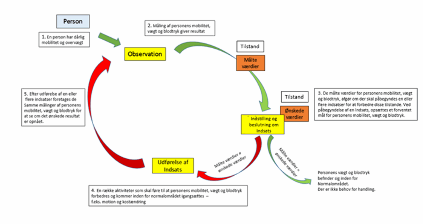 Disse tilstande er udgangspunktet for om der skal påbegyndes en indsat for borgeren. Hvis tilstandene vurderes som værende i et område hvor det kræver en intervention, påbegyndes en eller flere indsatser for at forbedre disse tilstande for borgeren. Der opsættes et mål for tilstandene, eksempelvis i dette tilfælde, en mobilitet som er alderssvarende for borgeren, samt vægt og blodtryk inden for ‘normalområdet’.