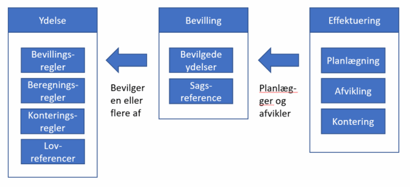 - Ydelse: Beskriver det, der kan bevilges til borgere og virksomheder. Der er 4 typer af ydelser: