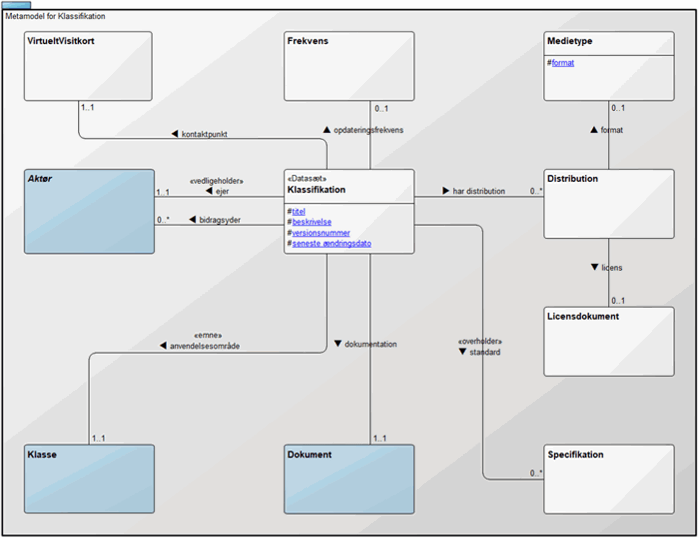Relevante metadata om klassifikationer dokumenteres med en metamodel for Klassifikation, der tager udgangspunkt i den danske anvendelsesprofil til beskrivelse af datasæt og datakataloger DCAT-AP-DK 2.0.