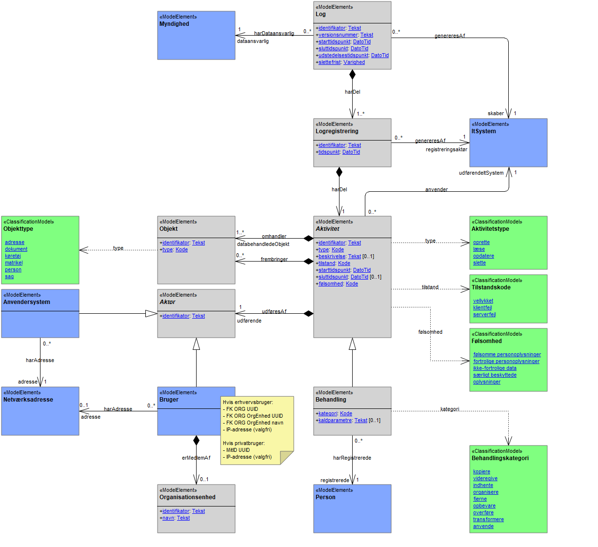 Datamodellen beskriver den logiske struktur for data om logning. Modellen angiver, hvilke informationer der kan registreres, og hvordan disse informationer relaterer sig til hinanden, herunder data om: