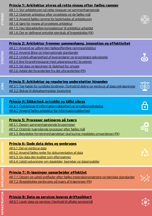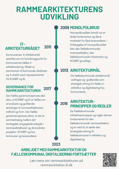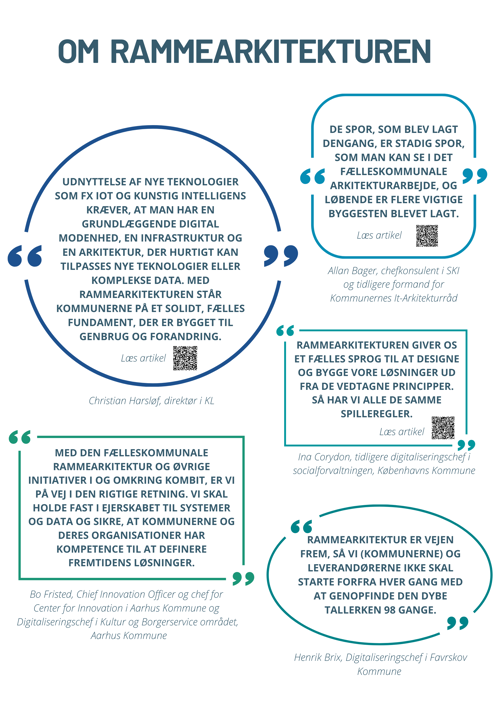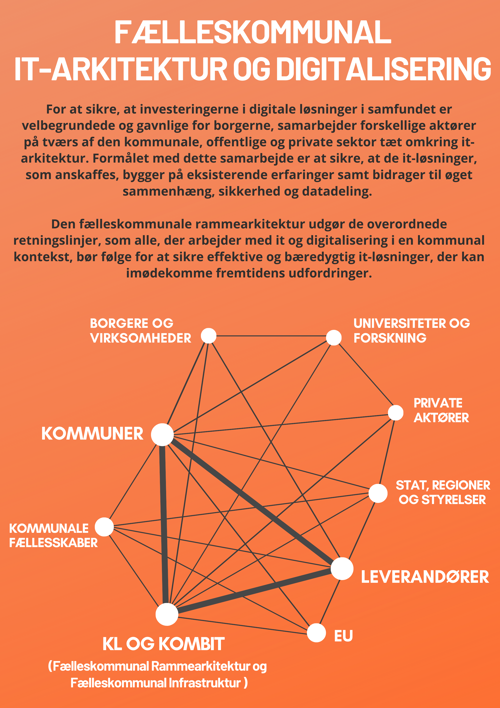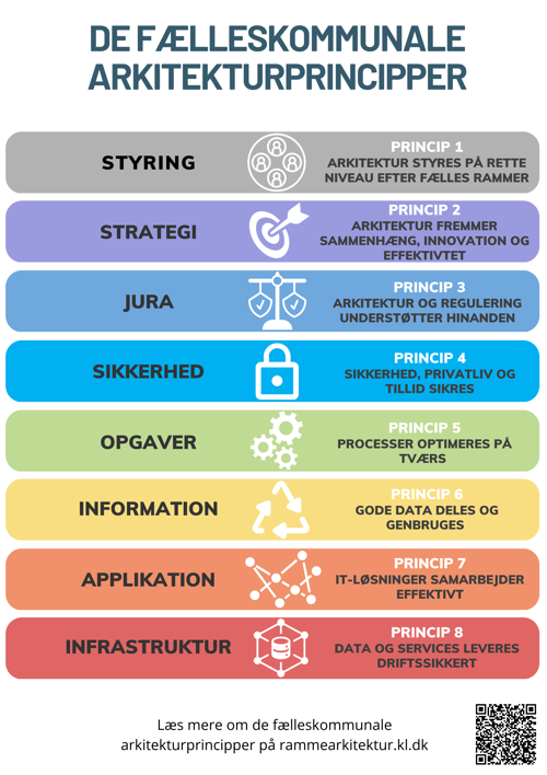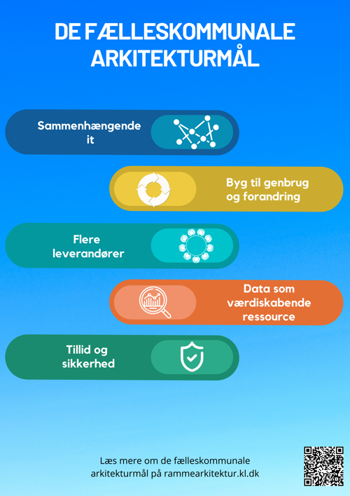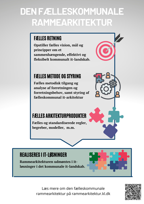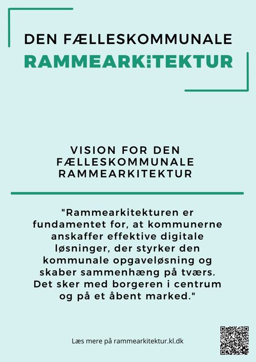 På denne side kan du finde Informative illustrationer om rammearkitekturen. Plakaterne kan anvendes til at opnå indblik og kendskab til rammearkitekturen. Plakaterne kan printes og hænges op for at skabe opmærksomhed samt udbrede rammearkitekturens budskad samt kommunernes fælles strategiske retning om it-arkitektur og digitalisering.