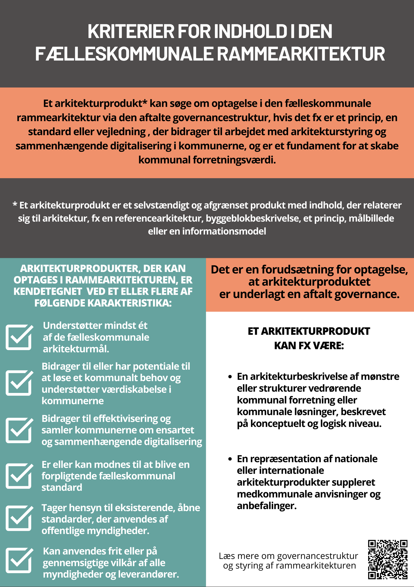 Et arkitekturprodukt kan søge om optagelse i den fælleskommunale rammearkitektur via den aftalte governancestruktur, hvis det fx er et princip, en standard eller vejledning , der bidrager til arbejdet med arkitekturstyring og sammenhængende digitalisering i kommunerne, og er et fundament for at skabe kommunal forretningsværdi. Et arkitekturprodukt er Et selvstændigt og afgrænset arbejdsprodukt med indhold, der relaterer sig til arkitektur, fx en referencearkitektur, byggeblokbeskrivelse, et princip, målbillede eller en informationsmodel.