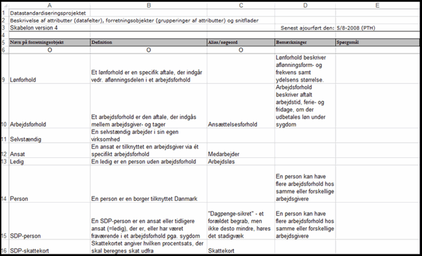 På de enkelte forretningsobjekter er tilknyttet de attributter, som var interessante ift. den begrebsafklaring som diagrammet lagde op til. Modelleringens forretningsobjekter, attributter og snitflader er ligeledes dokumenteret i en Excel-skabelon i en form og kvalitet, så beskrivelserne kunne indgå i det fællesoffentlige standardiseringsarbejde.