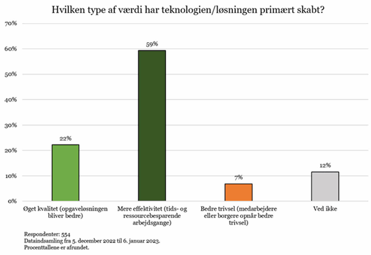 På det opfølgende spørgsmål om, hvilken værdi teknologien primært har skabt, svarer 59 procent af respondenterne, at teknologien har øget effektiviteten. 22 procent har svaret, at den primært øger kvaliteten af servicen.