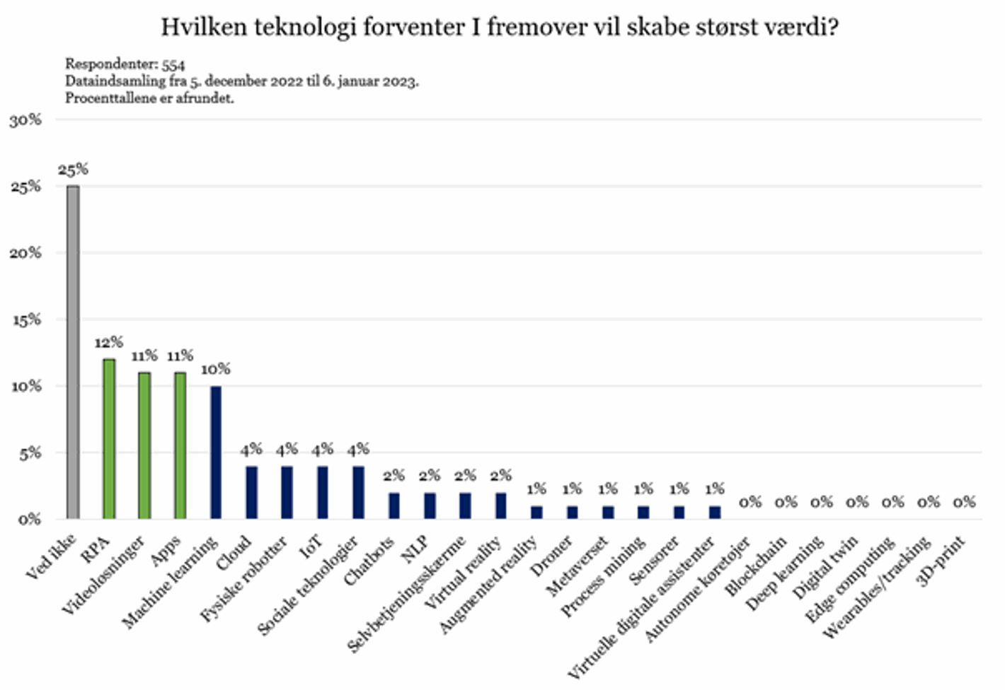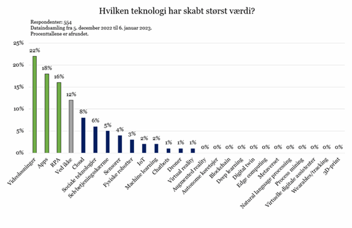 Af de respondenter, der valgte at give deres bud på fremtidens mest værdiskabende teknologi, var det igen RPA (12%), Videoløsninger (11%), og Apps (11%), der scorede højest.