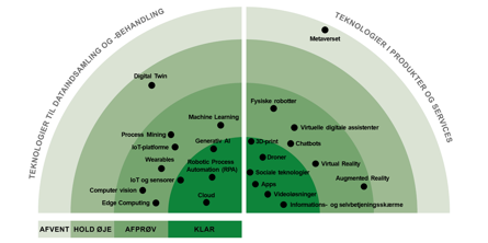 Teknologiradaren placerer teknologier i fire modenhedsstadier: KLAR, AFPRØV, HOLD ØJE og AFVENT. Placeringen af teknologi inden for de stadier er baseret på: