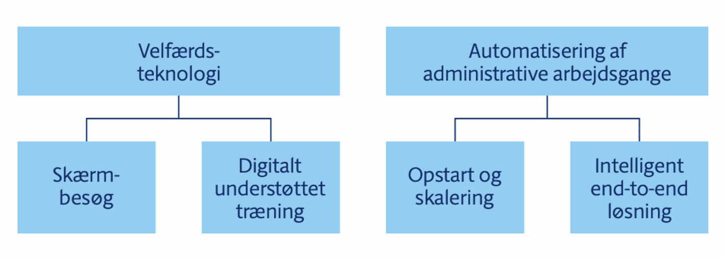 I Teknologipartnerskabet har kommunerne arbejdet med fire løsninger indenfor de to overordnede temaer: Velfærdsteknologi og Automatisering af administrative arbejdsgange.