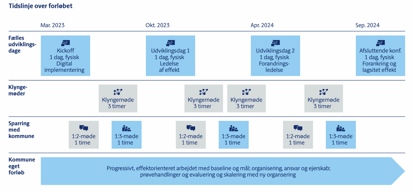 Samarbejde i klynger. De deltagende kommuner har været inddelt i klynger med andre kommuner, der arbejder med samme teknologi, og som har et sammenligneligt modenheds- og ambitionsniveau. Klyngemøderne har haft fokus på de særlige udfordringer og løsninger, hver enkelt kommune står overfor.