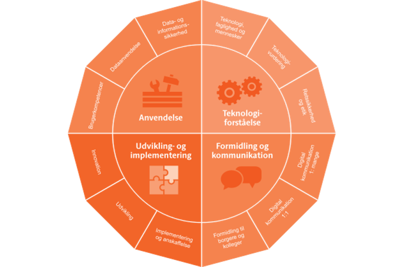 Læs om KL's kompetencehjul for fremtidens digitale kompetencer. Hjulet har fire overordnede dimensioner for fremtidens digitale kompetencer og 12 underdimensioner.