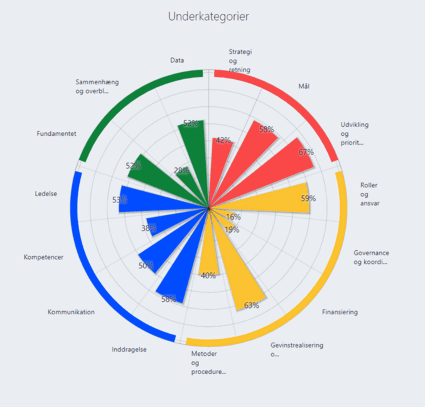 Værktøjet er et online spørgeskema, hvor man vurderer sin organisation ud fra fire overordnede kategorier – strategi, styring, forankring, teknik.